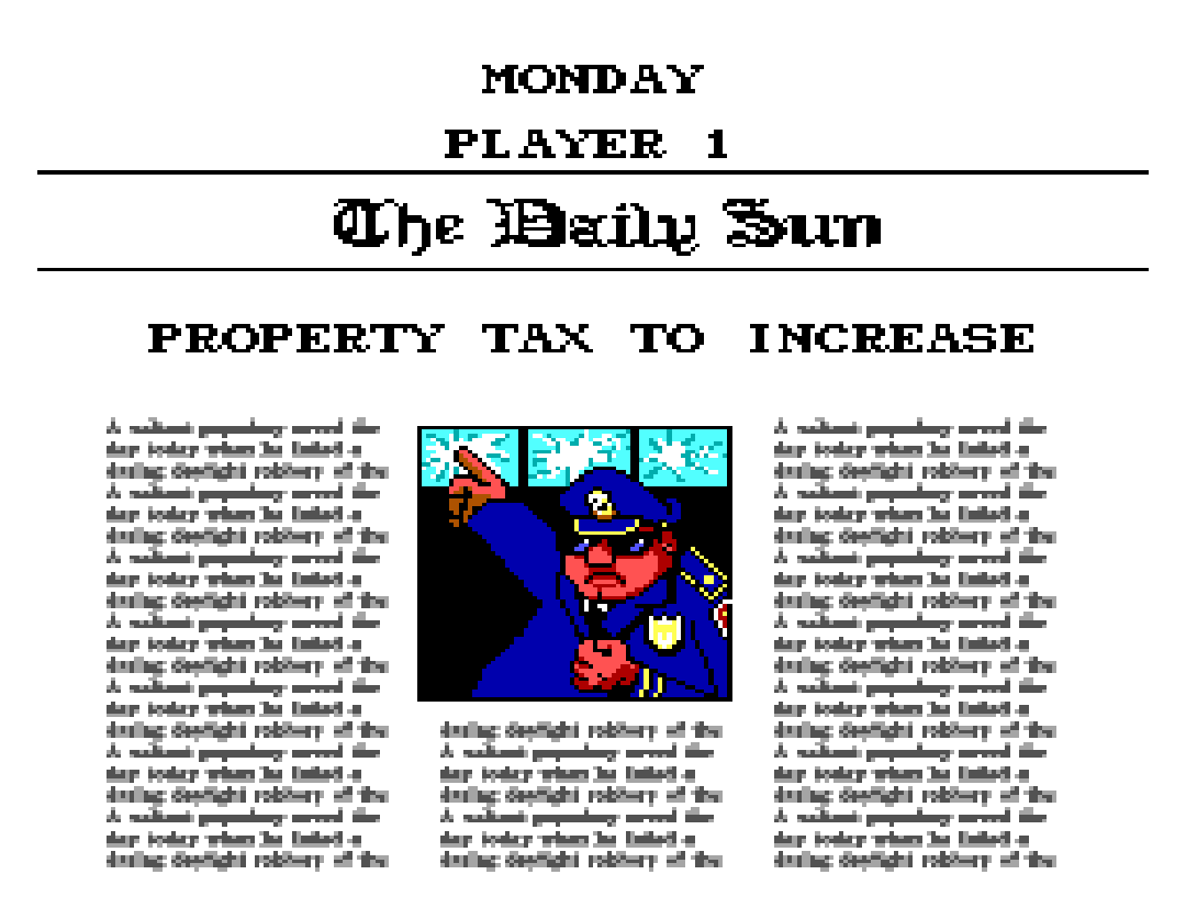 But Paperboy 2 also imparted another, far more acerbic, lesson: Heroism didn’t count if it sacrificed the wrong people’s comforts. Inflicting certain kinds of property damage overrode whatever good you did, prompting the headlines to ignore your potentially lifesaving deeds and emphasize the tragic loss of material possessions or rich-person luxury. “HOSED BATHER FILES COMPLAINT,” the paper reported if a stray newspaper broke a lawn sprinkler, drenching a nearby sunbather. “BROKEN PANES PUZZLE POLICE,” trumpeted another of the game’s many property-centric headlines. The photograph accompanying every such story showed the ubiquitous police chief before a background of broken windows, gesturing as if the busted glass constituted an emergency.